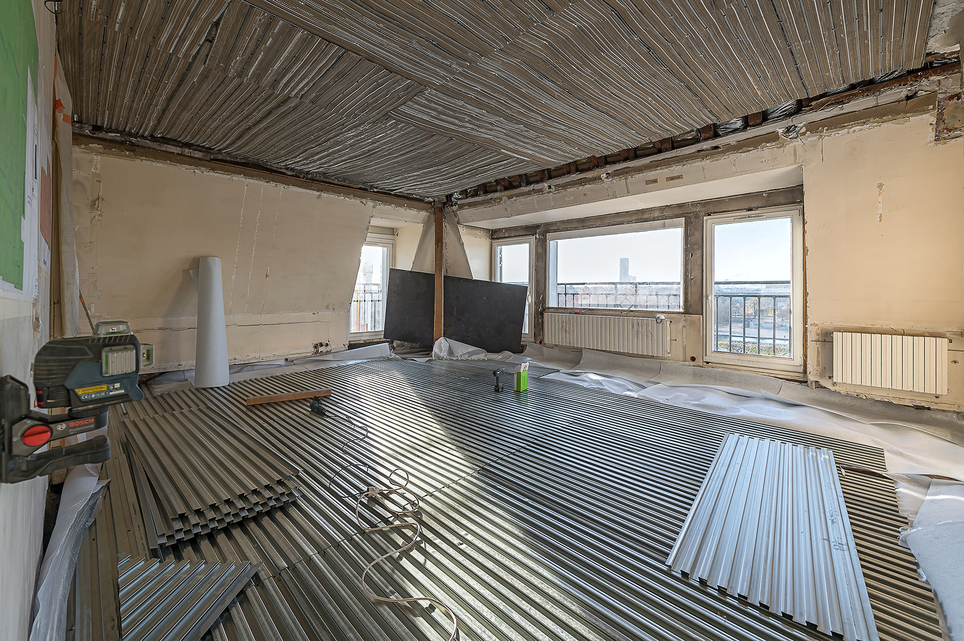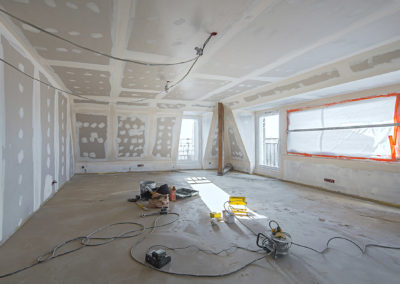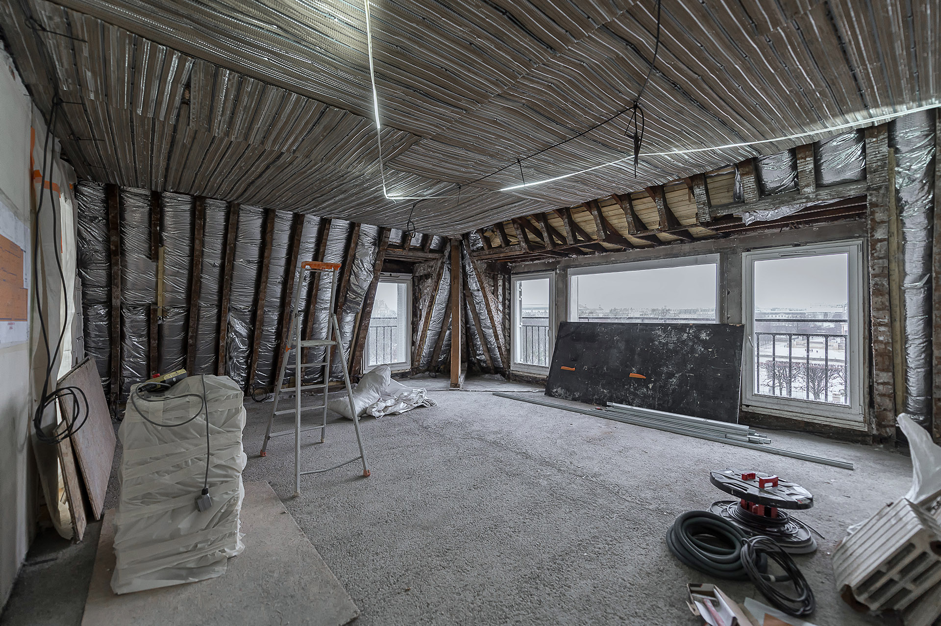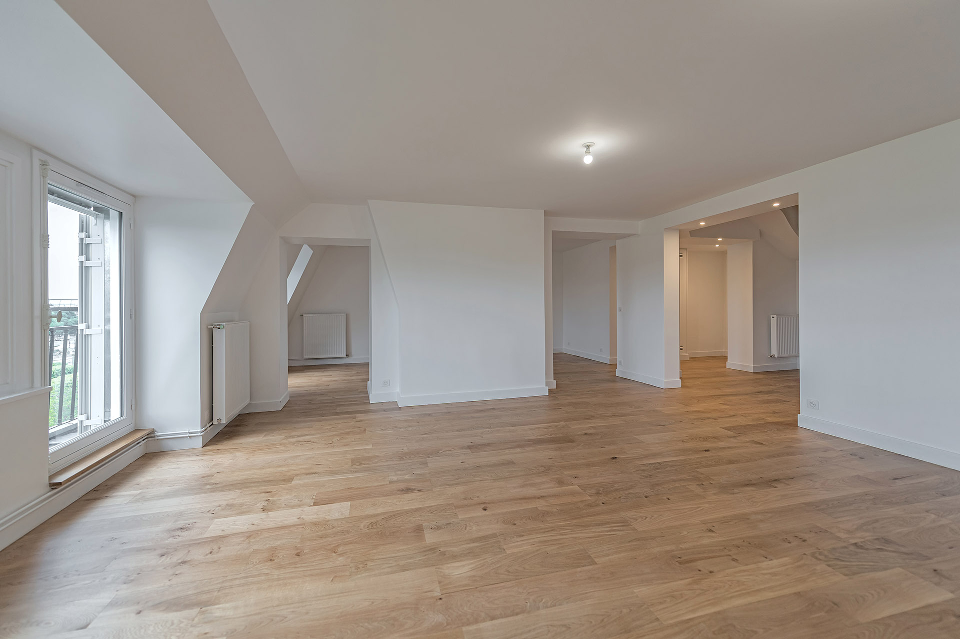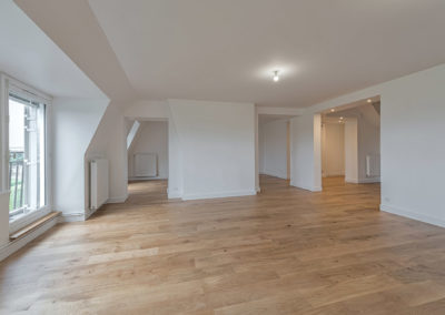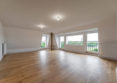Restructuration complète des combles de ce bel immeuble donnant sur les Tuilleries. Nous avons réalisé un appartement en duplex T5, un appartement T4, et un Studio, nécessitant de nombreuses reprises en sous-œuvre pour agrandir chaque espace.