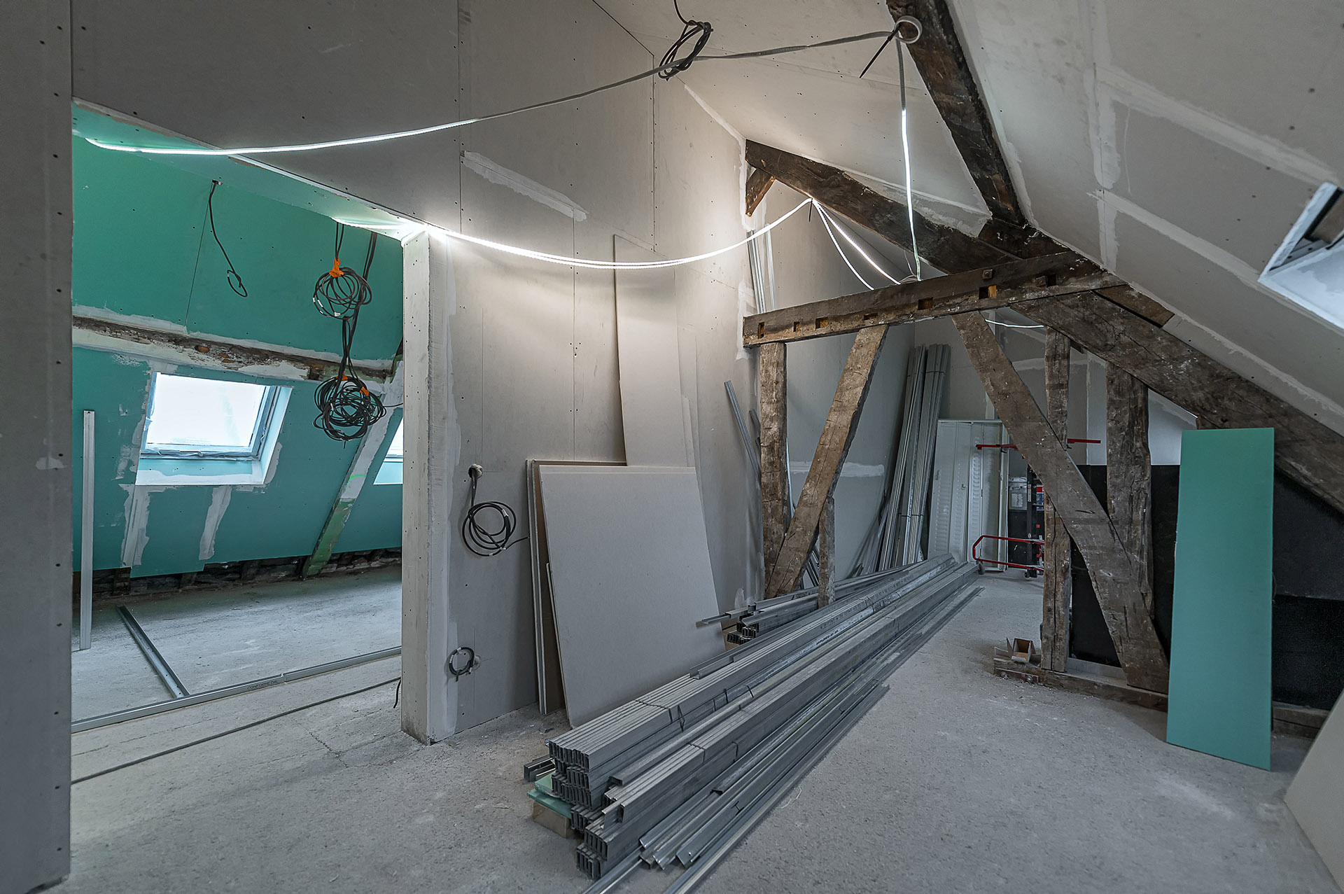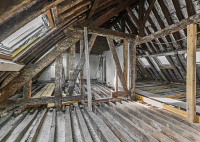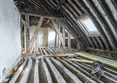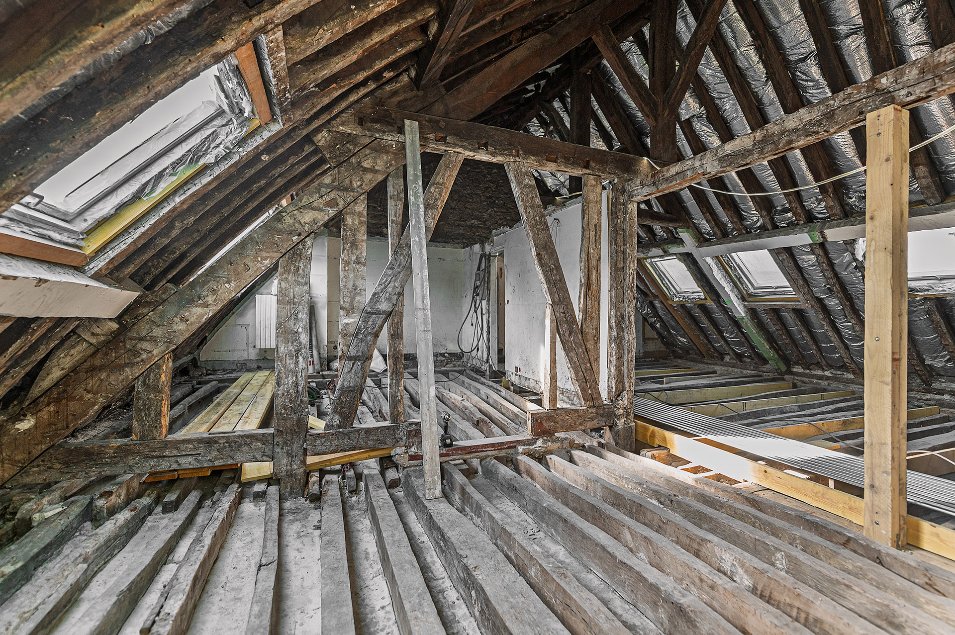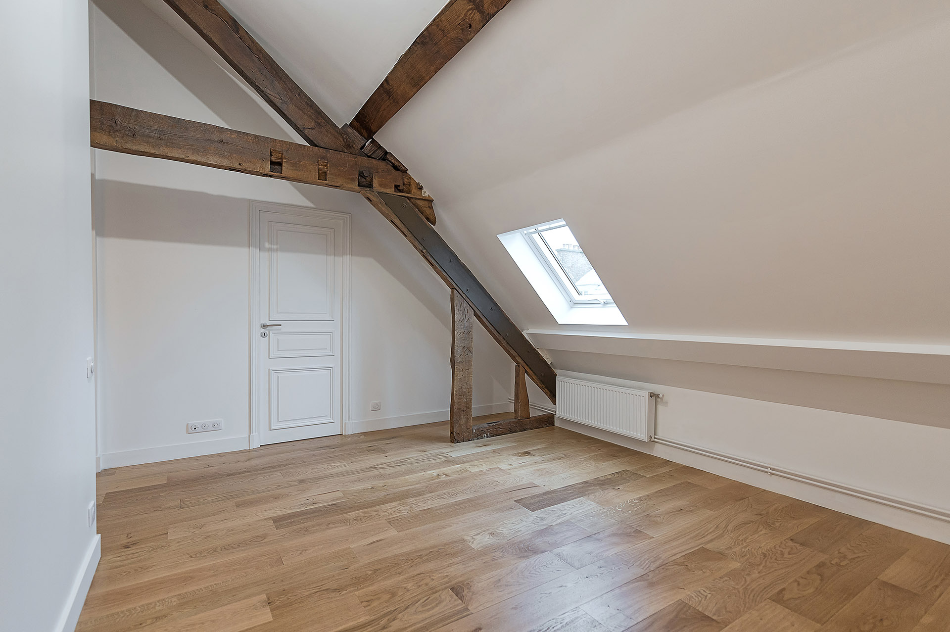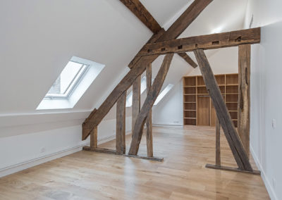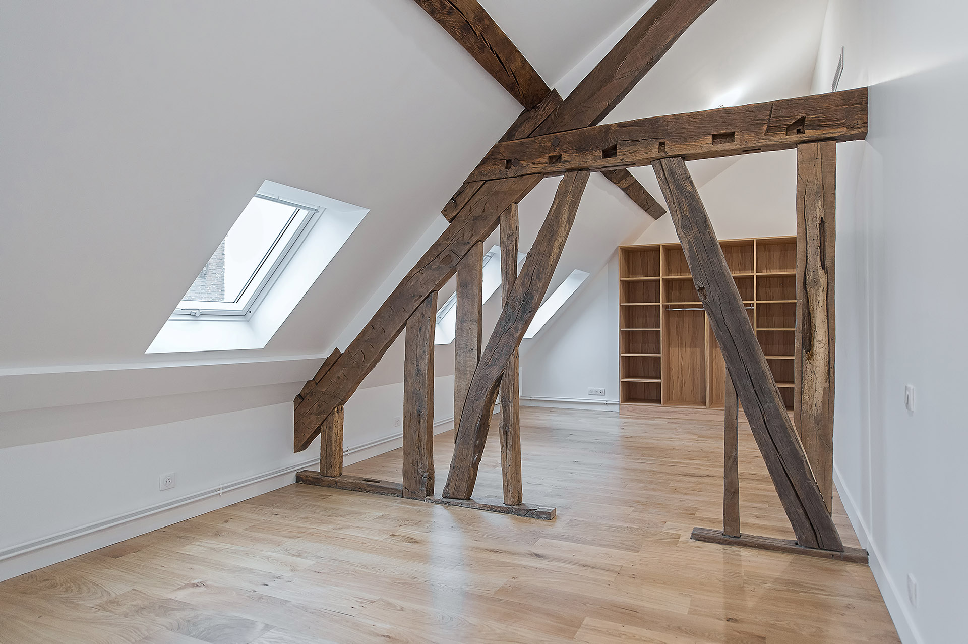 La charpente a été conservée visible autant que possible pour garder le charme des combles. Le dernier niveau a été climatisé. Toutes les menuiseries extérieures ont été changées en conservant leur aspect d’origine.