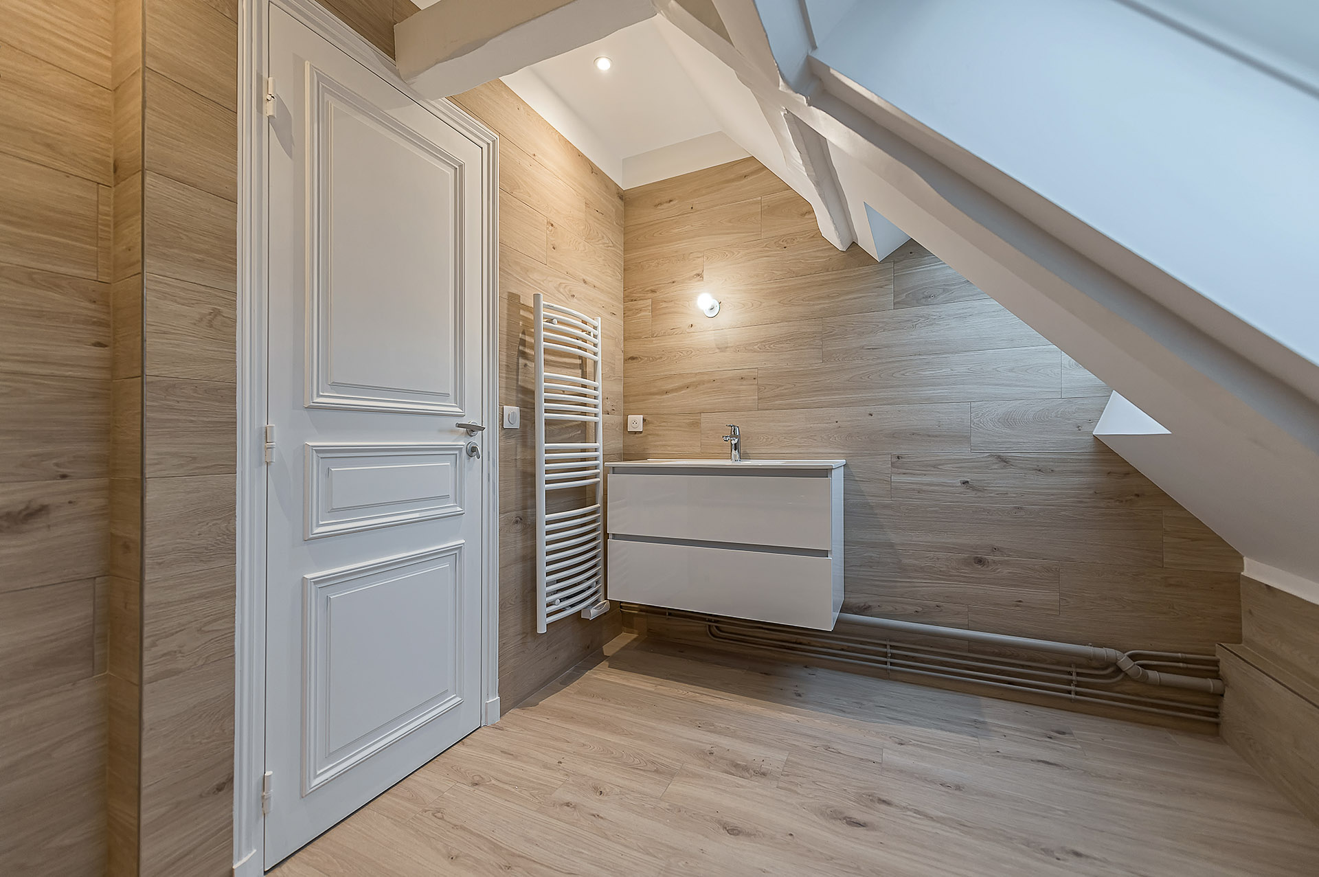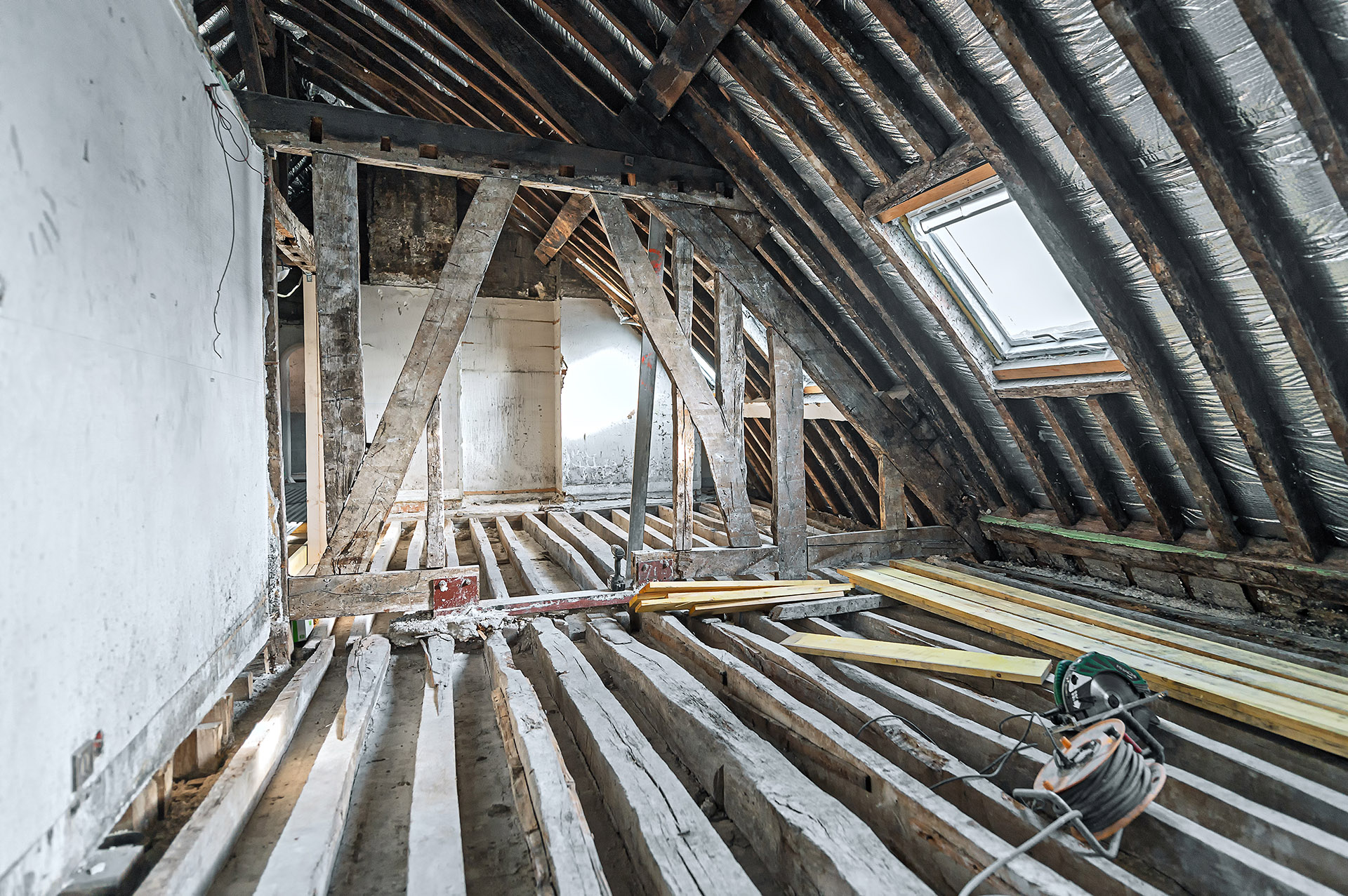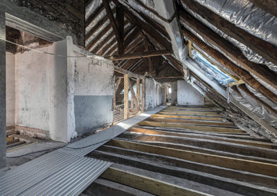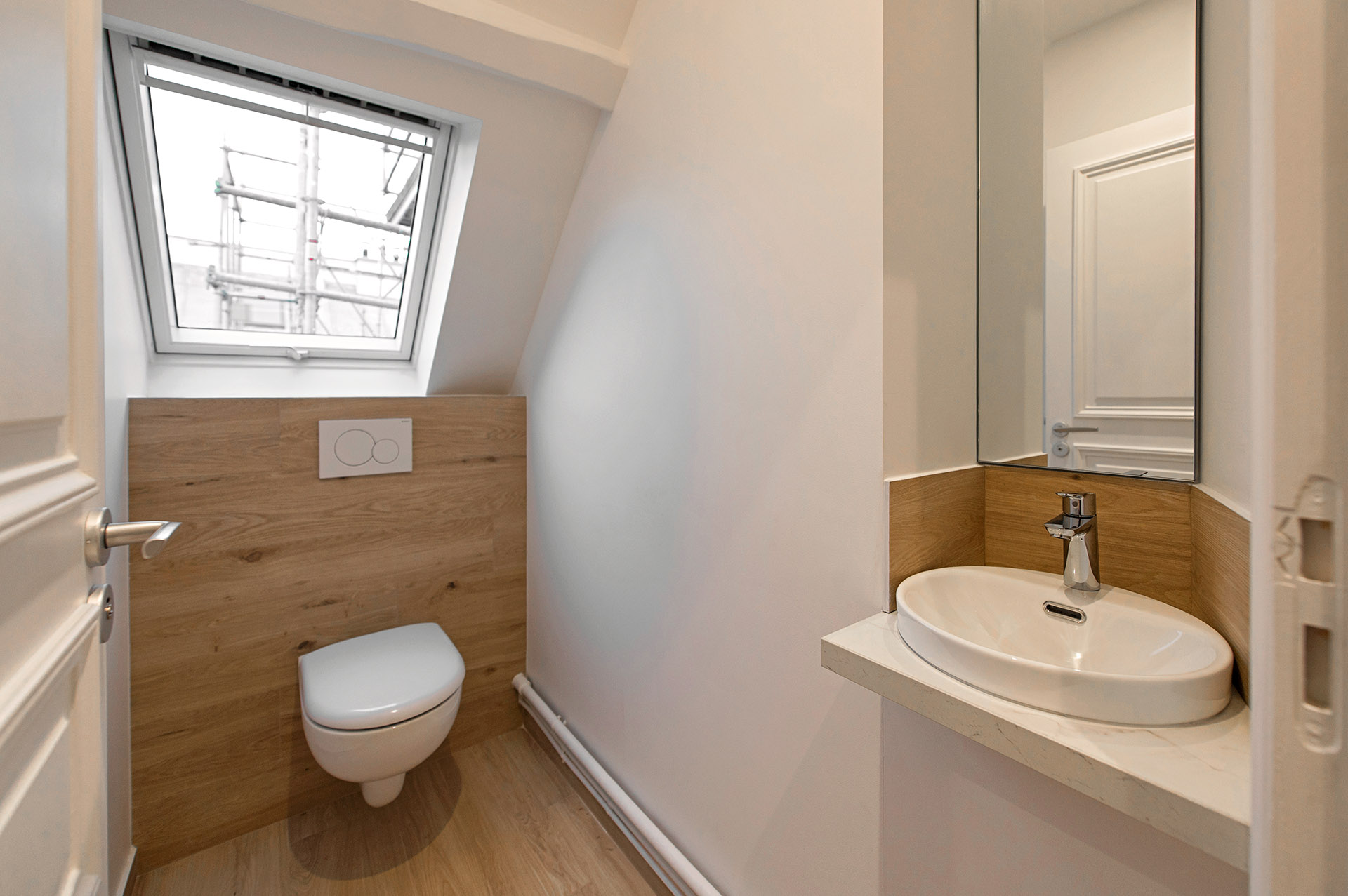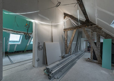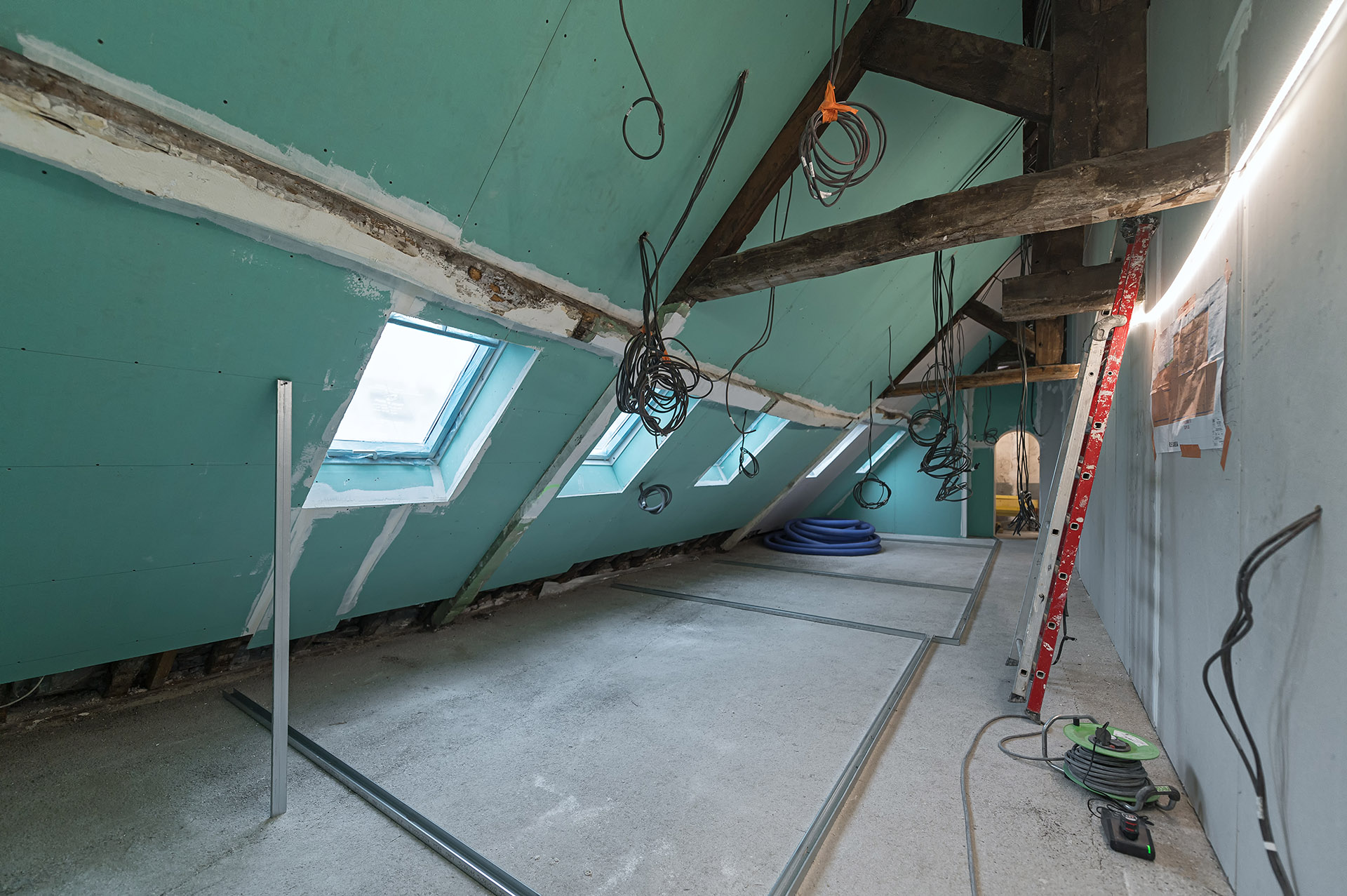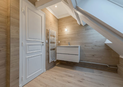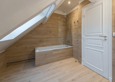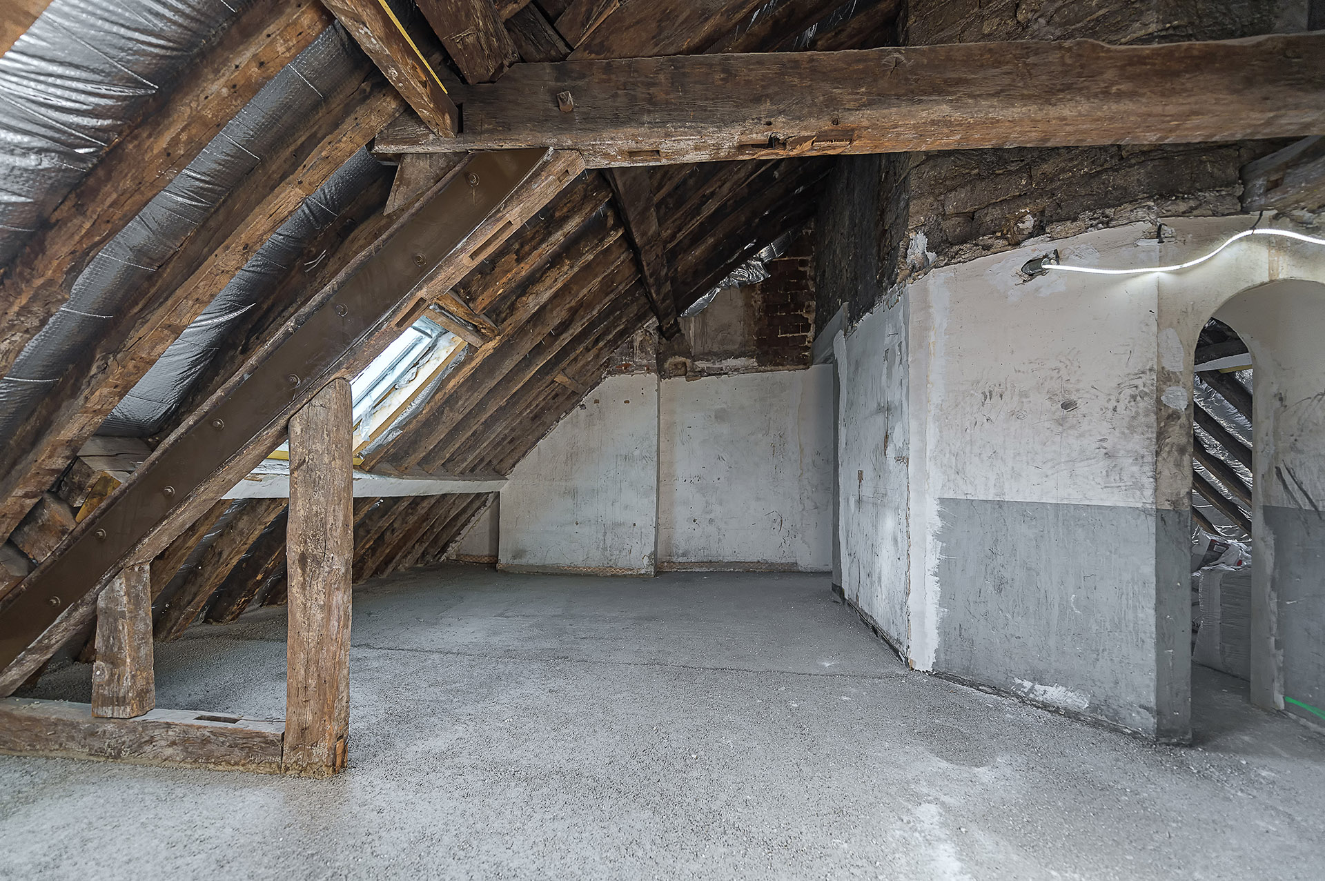 La charpente a été conservée visible autant que possible pour garder le charme des combles. Le dernier niveau a été climatisé. Toutes les menuiseries extérieures ont été changées en conservant leur aspect d’origine.