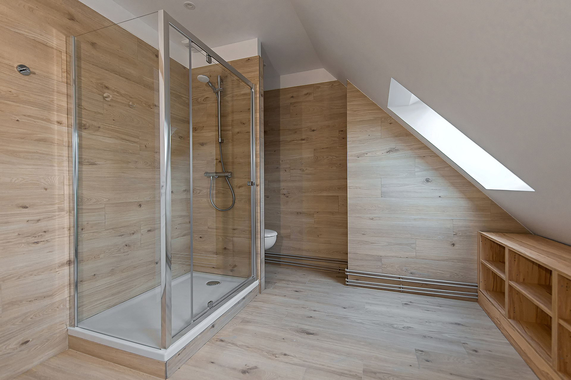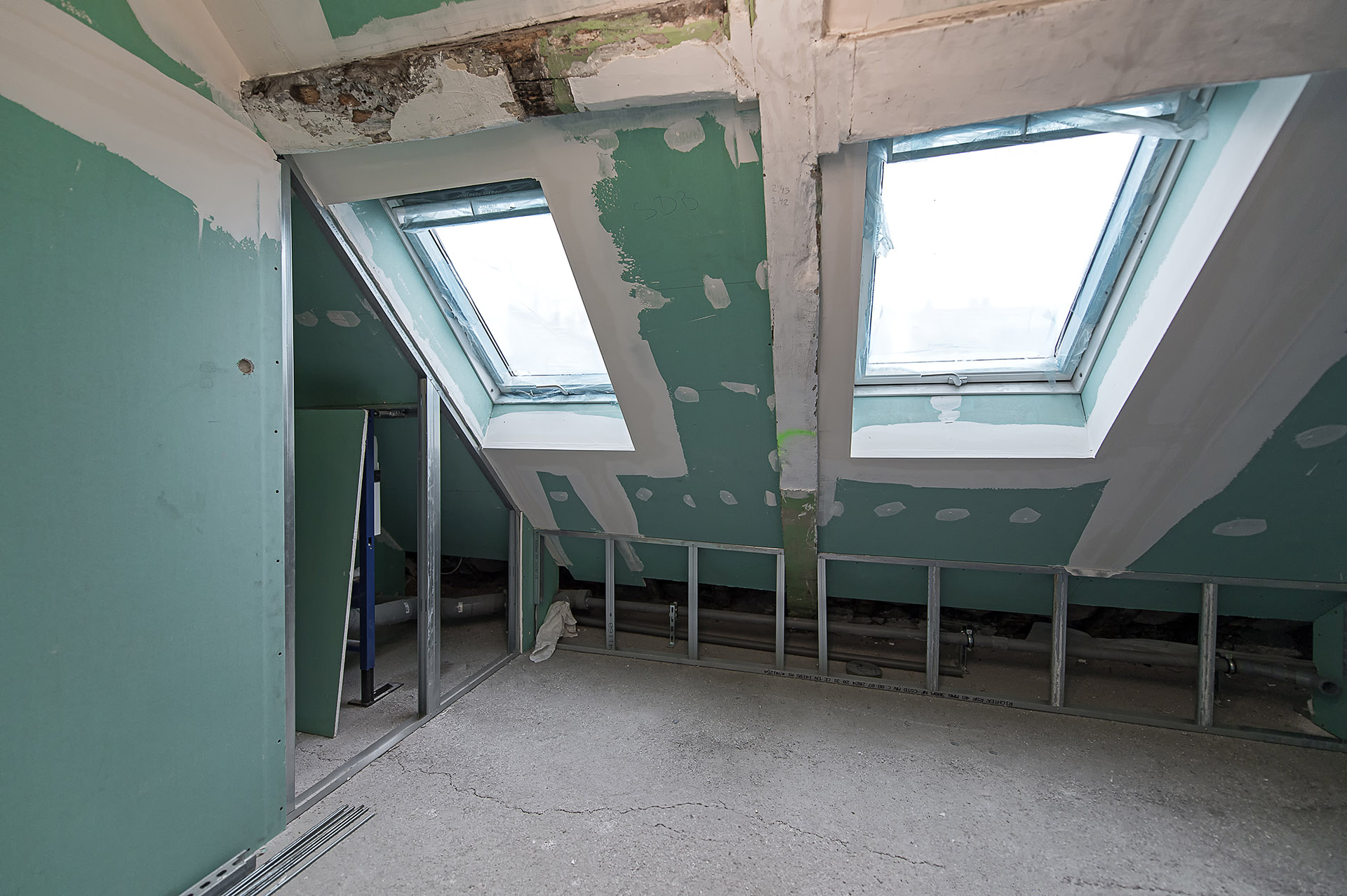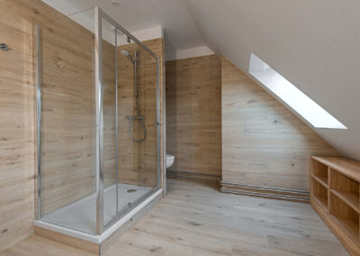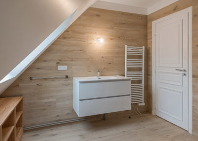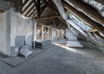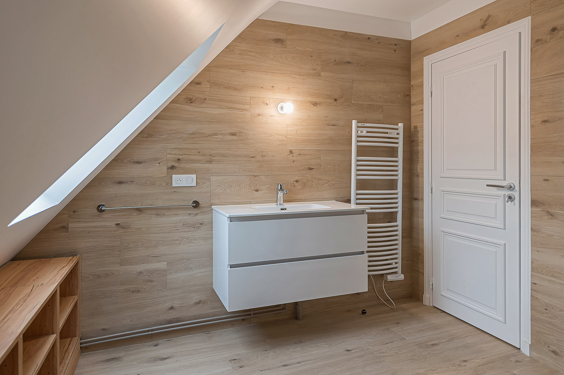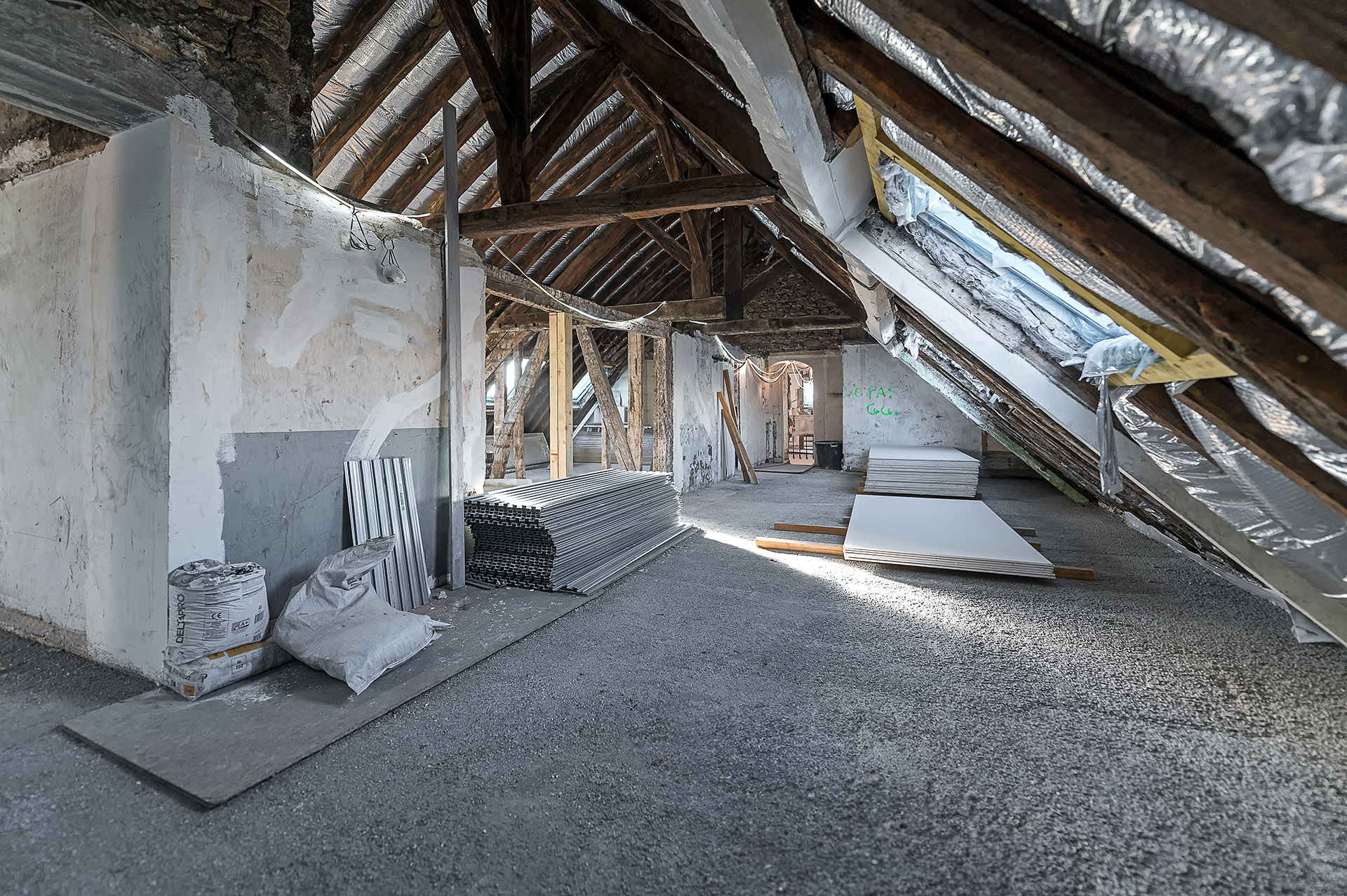 La charpente a été conservée visible autant que possible pour garder le charme des combles. Le dernier niveau a été climatisé. Toutes les menuiseries extérieures ont été changées en conservant leur aspect d’origine.